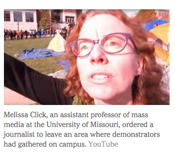Now, protestors on campus and campus faculty are taking the situation to a whole new extreme. When a reporter went into a protest "safe space" camp yesterday to ask some questions about their goals and motives, a Mizzou assistant media professor demanded that he leave. Her name is Melissa Click and according to her bio, she's currently researching 50 Shades of Gray and the relationship Lady Gaga has with her fans on social media. When the reporter refused, she went around the camp asking for "some muscle" to remove him. Ironically, the reporter is a student reporter for the Mizzou student newspaper.