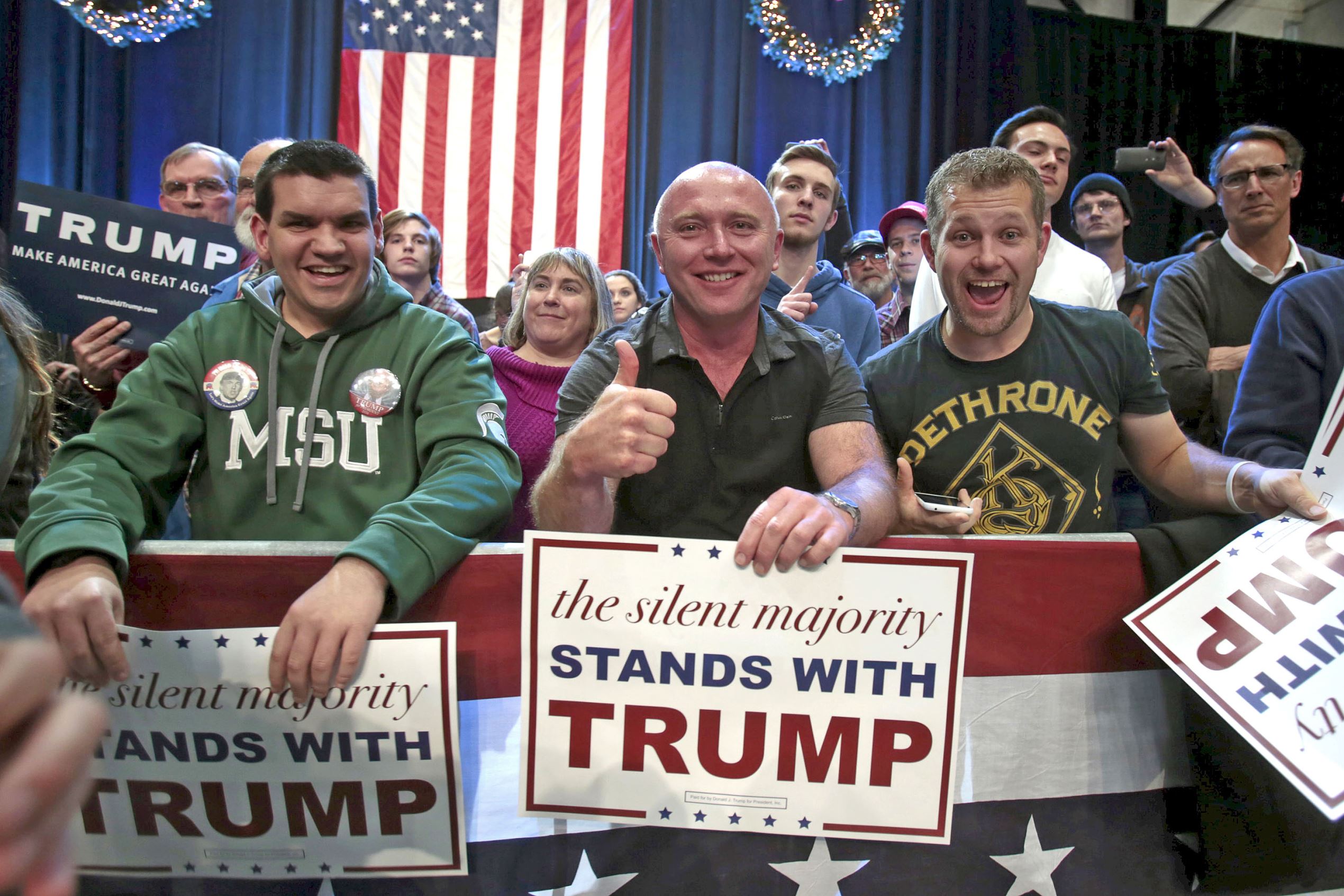 Trump supporters listen as U.S. Republican presidential candidate Donald Trump speaks during a campaign rally in Grand Rapids, Michigan December 21, 2015. One-third of Republicans Trump supporters said they would not support the party in the general election if the businessman is blocked from the nomination. They said they would instead vote Democrat, vote third-party or sit out the election. Sixty-six percent said they would support the GOP's nominee anyway. A contested convention could hurt the GOP in November no matter what, the poll found. Fifty-eight percent of Trump supporters said they would stay with the party, while 16 percent would leave and 26 percent said they didn't know.
